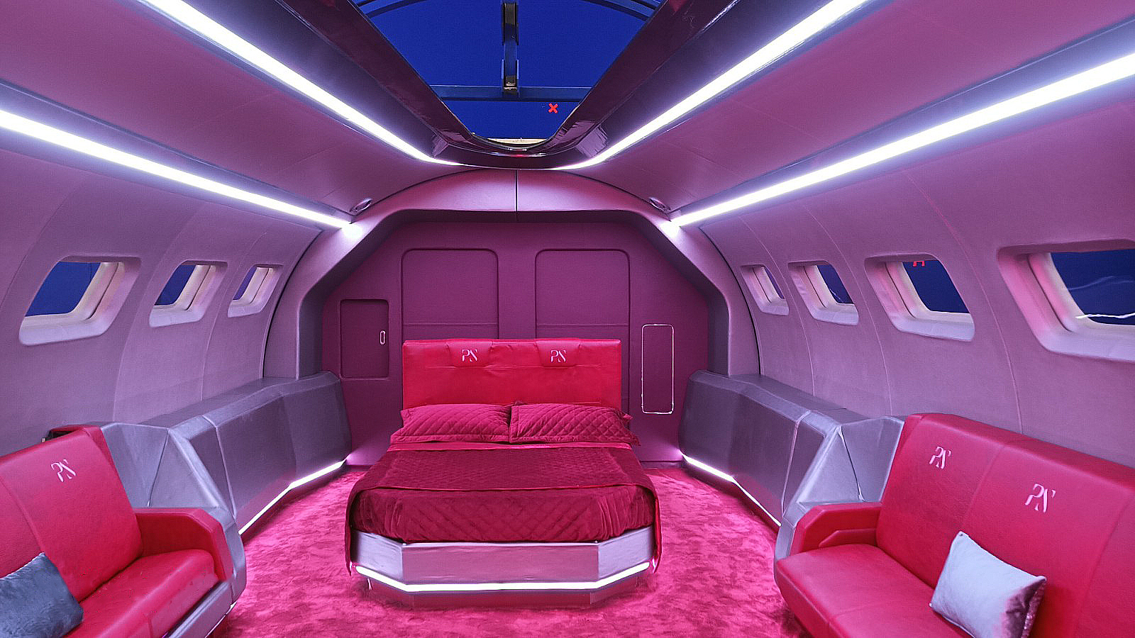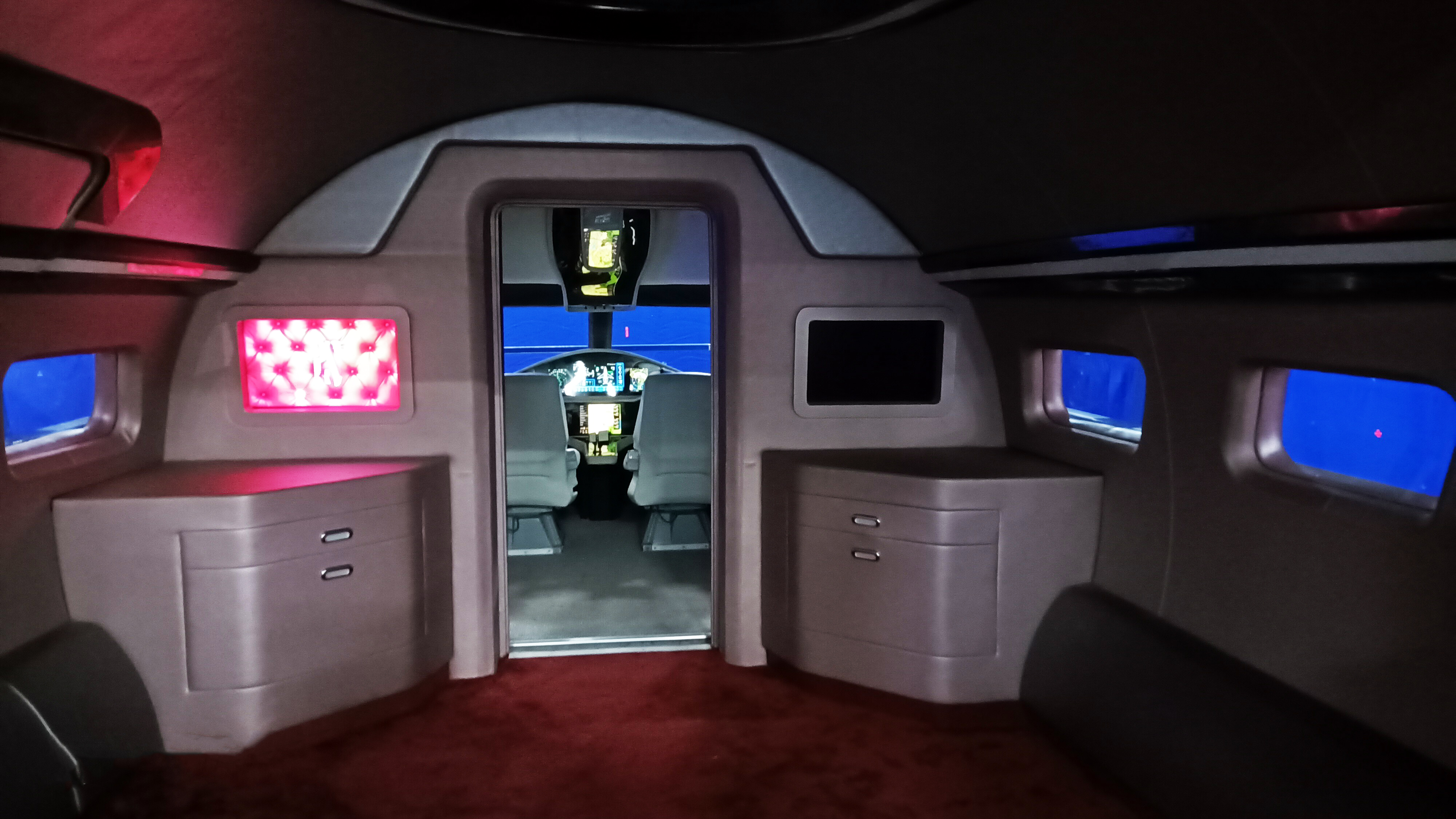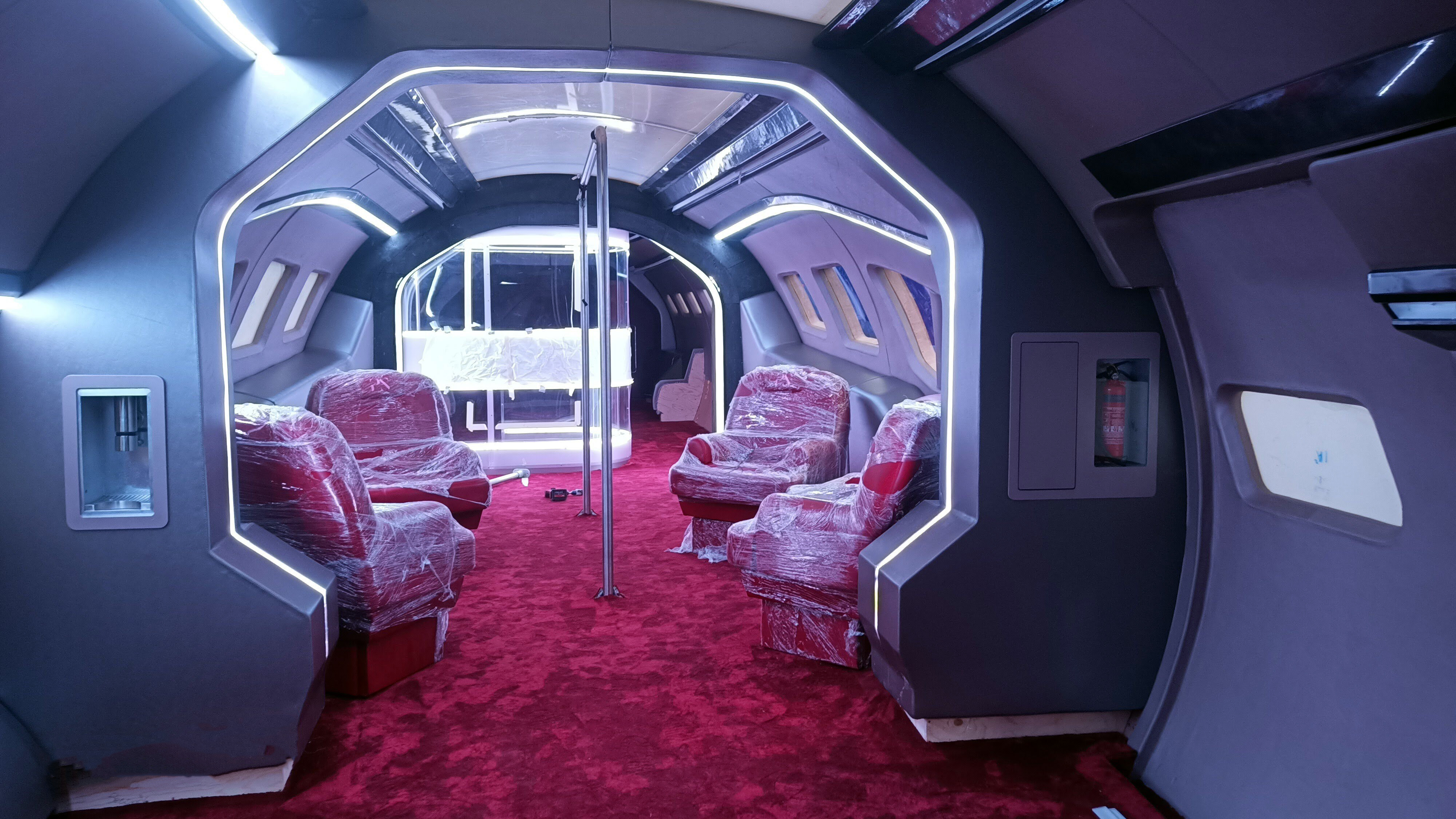 The private jet built was built in three parts. 1st Part was fixed – Lounge, bedroom, bathroom, galley.